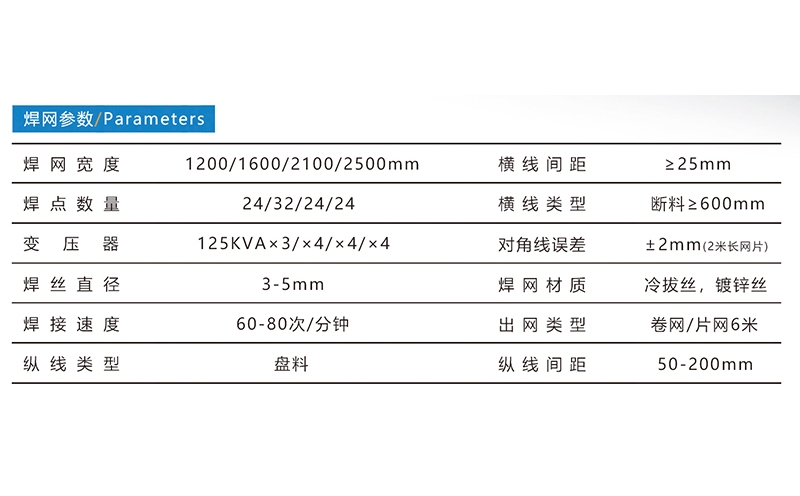 鋼絲網(wǎng)焊接生產(chǎn)線,焊接網(wǎng)寬度1200mm/1600mm/2100mm/2500mm,焊接絲徑3-5mm,焊接速度為60-80次/分鐘,縱線為盤(pán)料,橫線為斷料。標(biāo)準(zhǔn)配置:放線盤(pán)、經(jīng)絲壓輥、焊接主機(jī)、料斗、拉網(wǎng)??蛇x配置:校直輪裝配、剪網(wǎng)機(jī)、自動(dòng)卸網(wǎng)卷網(wǎng)機(jī)、方管卷網(wǎng)機(jī)、落網(wǎng)裝置+落料小車(chē)、料斗平臺(tái)帶梯子、簡(jiǎn)易循環(huán)冷卻器、出網(wǎng)平臺(tái)。河北驕陽(yáng)焊工有限公司,0318-7063097