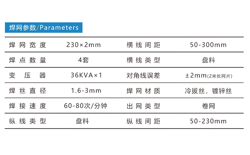 磚帶網(wǎng)焊接生產(chǎn)線,采用盤絲入料,自動校直焊接,焊網(wǎng)寬度230mm×2,焊接絲徑1.6-3mm,焊點數(shù)量4套,焊接速度約60-80次/分鐘,出網(wǎng)形式為卷網(wǎng)。標(biāo)準(zhǔn)配置:放線盤、導(dǎo)線架、緩料裝置、縱線橫線校直系統(tǒng)、橫線切斷裝置、伺服送網(wǎng)??蛇x配置:空壓機。河北驕陽焊工有限公司,0318-7063097