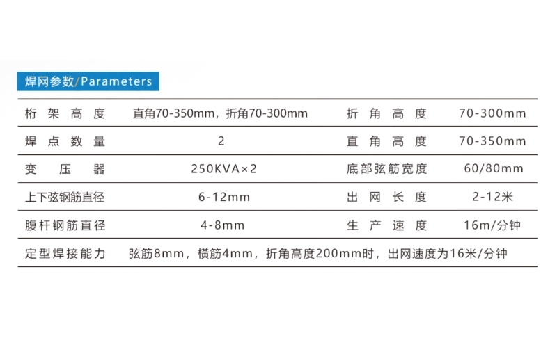 鋼筋桁架焊接生產(chǎn)線,上下弦絲直徑6-12毫米,波浪絲直徑4-8毫米,波峰間距190-210毫米可調(diào),桁架高度70-300毫米,工作速度可達(dá)16米/分鐘,整機(jī)PLC控制。標(biāo)準(zhǔn)配置:帶緩料放線盤、校直輪、儲(chǔ)料裝置、腹桿壓型裝置、焊接主機(jī)??蛇x配置:冷水機(jī)、空壓機(jī)。河北驕陽焊工有限公司,0318-7063097
