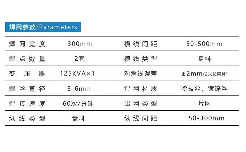 磚帶網(wǎng)焊接生產(chǎn)線,采用盤絲入料,自動校直焊接,焊網(wǎng)寬度300mm,焊接絲徑3-6mm,焊點數(shù)量2套,焊接速度約60次/分鐘,出網(wǎng)形式為片網(wǎng)。標(biāo)準(zhǔn)配置:放線盤、緩料檢測裝置、縱線橫線校直系統(tǒng)、橫線叼絲剪切裝置、伺服送網(wǎng)??蛇x配置:簡易循環(huán)冷卻器、空壓機。河北驕陽焊工有限公司,0318-7063097
