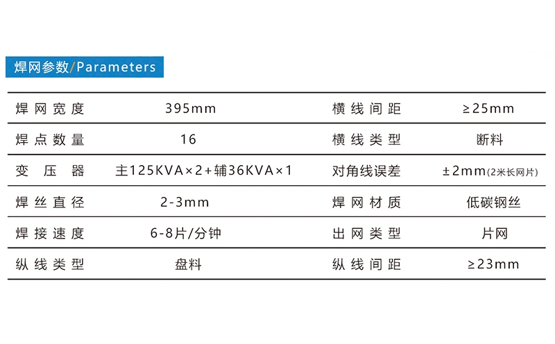 蛋雞籠隔片網(wǎng)焊接生產(chǎn)線,焊網(wǎng)寬度395mm,焊接絲徑2-3mm,焊接速度為6-8片/分鐘,橫線為斷料,縱線為盤料。標準配置:放線盤、儲料+校直輪、雙層料斗+自動落網(wǎng)、伺服往復拉網(wǎng)??蛇x配置:出網(wǎng)平臺(配剪板機)、簡易循環(huán)冷卻器。河北驕陽焊工有限公司,0318-7063097