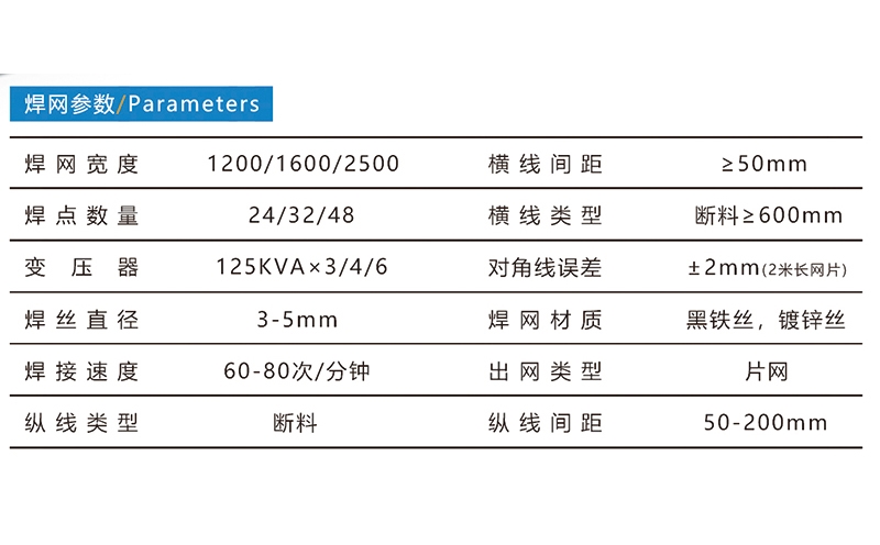 護(hù)欄網(wǎng)焊接生產(chǎn)線,焊接網(wǎng)寬度1200mm/1600mm/2500mm,焊接絲徑3-5mm,焊接速度為60-80次/分鐘,縱線橫線均為斷料。標(biāo)準(zhǔn)配置:托絲平臺(tái)、料斗、拉網(wǎng)平臺(tái)、小梯子??蛇x配置:縱線送料小車、簡易循環(huán)冷卻器、料斗平臺(tái)梯子。河北驕陽焊工有限公司,0318-7063097